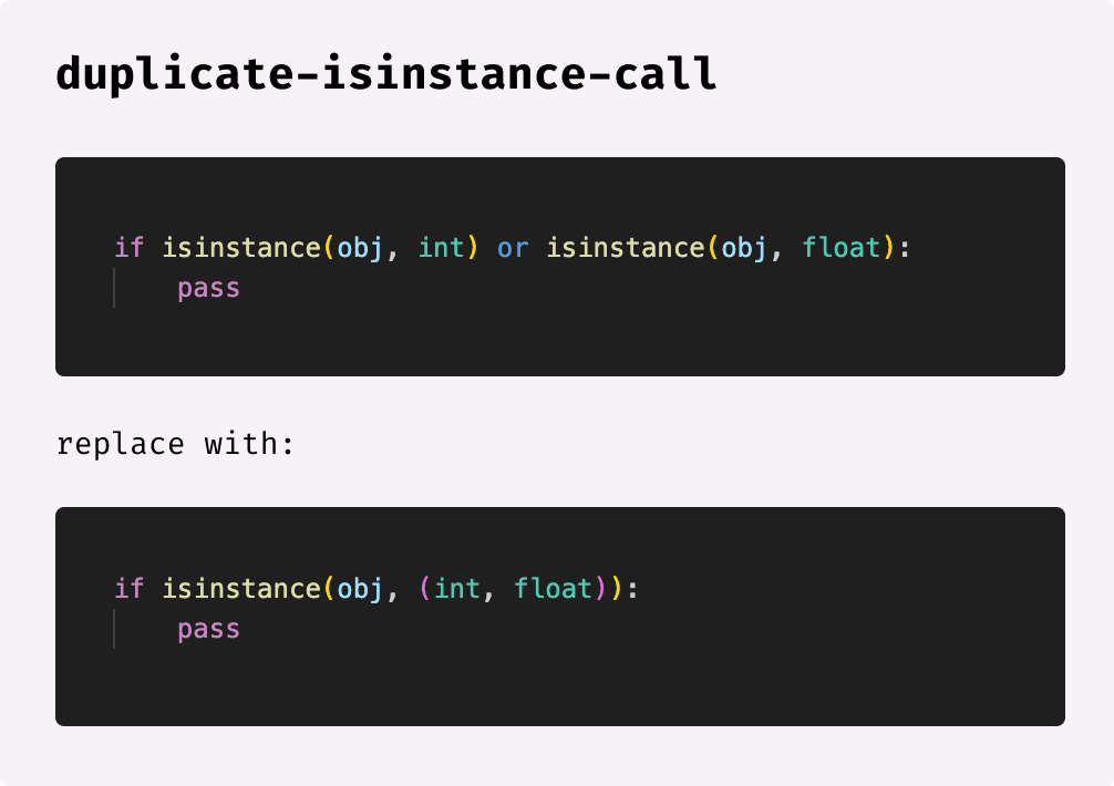 For example, using multiple isinstance calls for the same object is unnecessary and verbose. This is caught by a rule called duplicate-isinstance-call:
